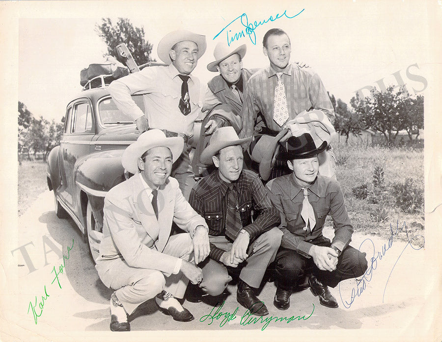 Beautiful black-and-white promo photograph from 1948 signed by 4 out of 6 of its members signed by Tim Spencer (1908-1974), Carl Farn (1909-1961), Lloyd Perryman (1917-1977), and Pat Brady (1914-1972).  Size is 10.25 x 7.8 inches, small crack over the left border, minor creases, in excellent condition.
