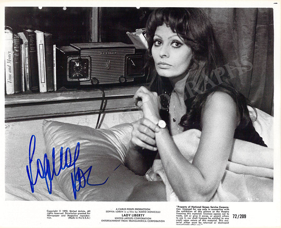 Nice black-and-white movie-still promo photograph of the film 'Lady Liberty' (1971) signed by the star actress. Size is 10.1 x 8.1 inches, in excellent condition.