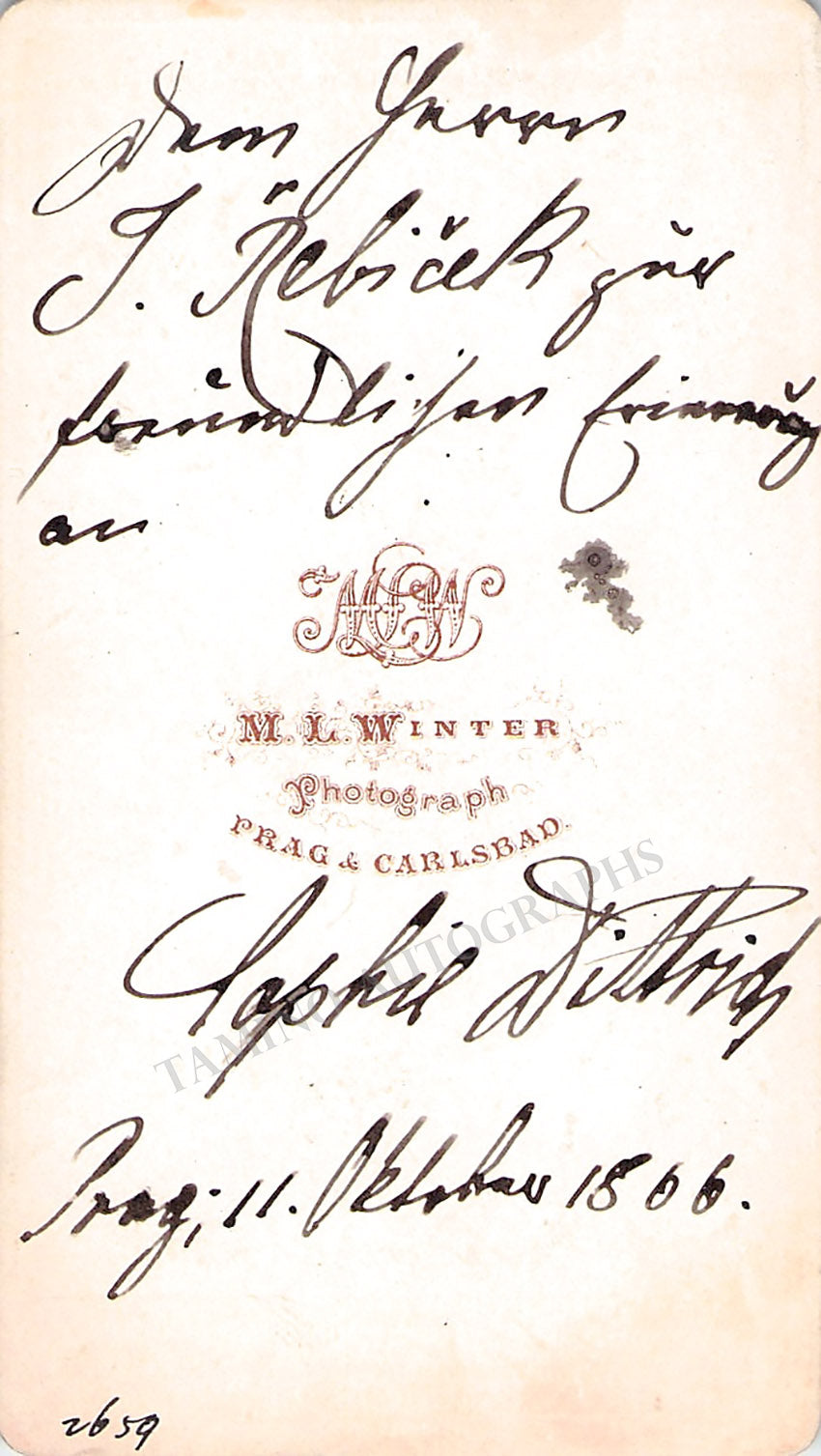 Beautiful carte-de-visite of the pianist by M.L. Winter (Prague), signed and inscribed by Dittrich, dated on verso in Prague, October 11th, 1866. Size is 2.3 x 4.1 inches, in excellent condition.