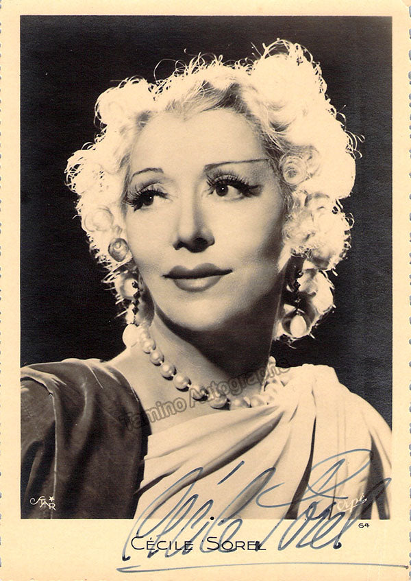 French comic actress (1873-1966), who enjoyed great popularity and was known for her extravagant costumes. Signed postcard photograph, shown in role, size is 4 x 5.75 inches in excellent condition.