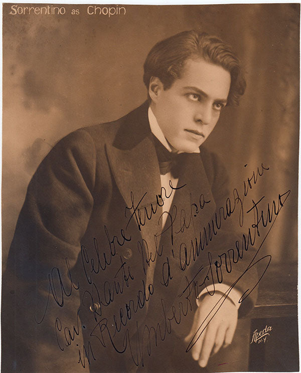 Italian tenor (1883-1959), signed photograph, shown as Chopin in Giacomo Orefice's opera of the same name, inscribed with sentiment. Stamped on verso by Apeda photo studio, New York. Size is 7 x 8.75 inches, small crack on the right side of the photo, otherwise in excellent condition.