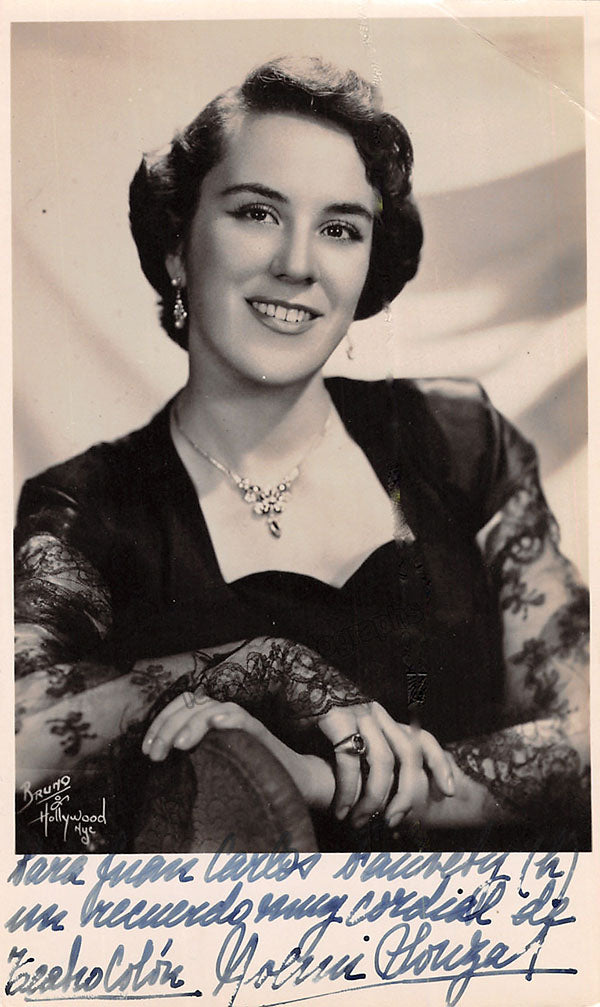 Argentinian mezzo-soprano (1929-2015), signed photograph, shown as herself, inscribed at Teatro Colon, Buenos Aires. Photo by Bruno of Hollywood and New York City. Size is 3.5 x 5.75 inches, crease on top right, but in generally good condition.