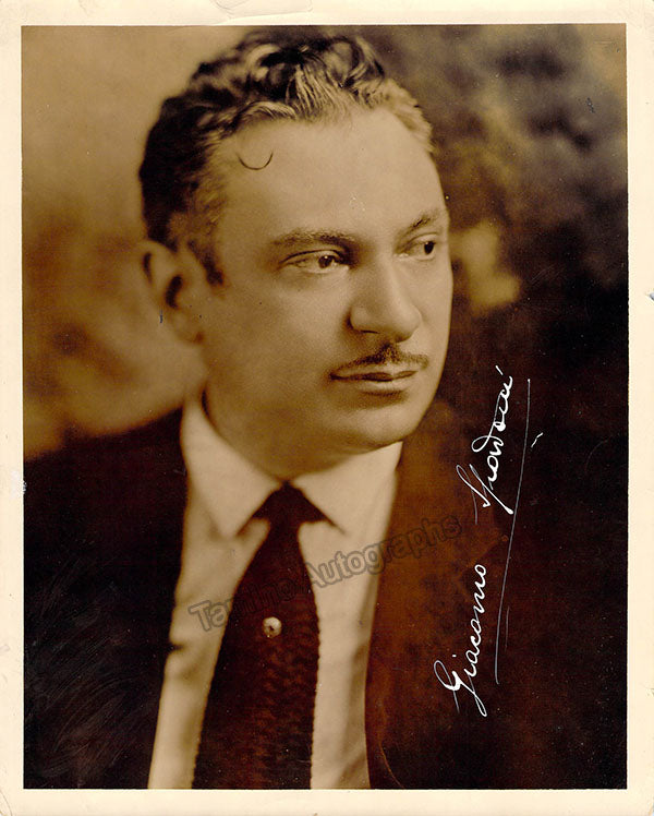 Italian orchestral and operatic conductor (1884-1960), was also an opera voice coach for Enrico Caruso and Mario Lanza, MGM and Warner Brothers Studios, and several leading American opera companies. Signed photograph, shown as himself. Stamped on verso by photographer Ray Davidson, Los Angeles. Size is 8 x 10 inches, slight crack on bottom left, and creases on other edges, otherwise in good condition.