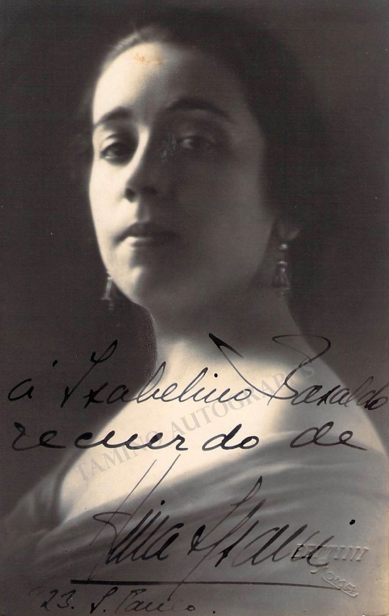 Argentine soprano (1896-1969).  Signed photo postcard, shown possibly in role, inscribed and dated in Sao Paulo in 1923. Blind stamped on front by photographer Bettini, Rome. Size is 3.5 x 5.5 inches, in excellent condition.