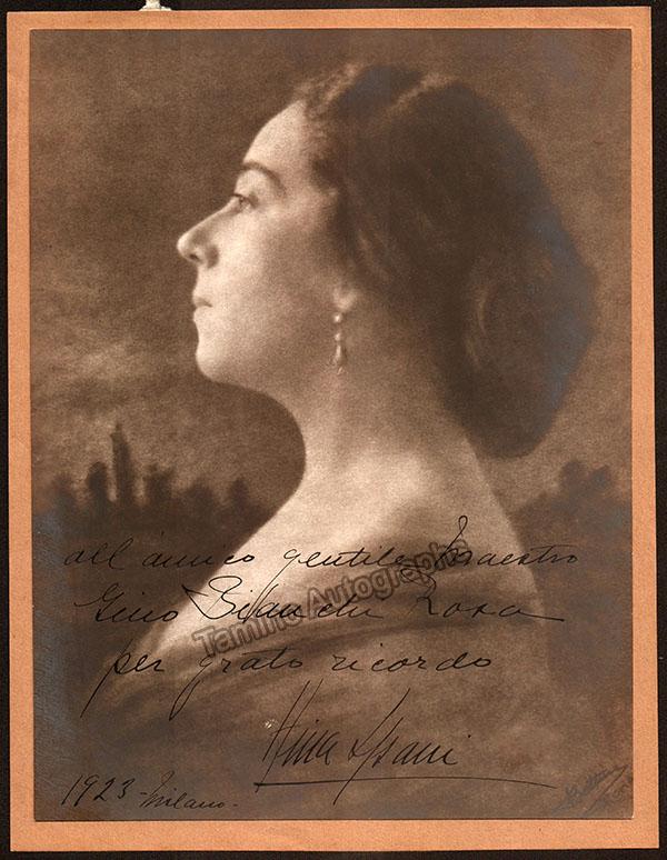 Argentine soprano (1896-1969) who enjoyed a major opera career centered on Italy during the 1920s and 1930s.  Signed photo shown as herself, inscribed and dated in Milan, 1923.  Photo is 8.1 x 10.75 inches in size mounted on a slightly larger brown paper, in excellent condition.