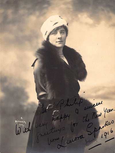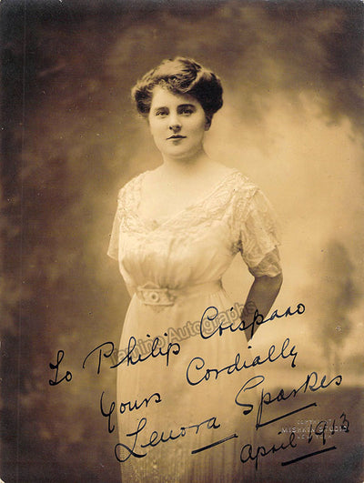 Signed and inscribed large photo, shown as herself, dated in 1913. Very clear signature with beautiful backdrop. Stamped on verso by Mishkin, New York. Size is 6 x 8 inches, in excellent condition.