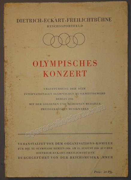 Special concert at the last evening of the Olympic Games 1936 in Berlin. Olympic Stadium, 15 August 1936. World premiere of music by Richard Strauss, and Kurt Thomas, Werner Egk, Paul Hoeffer, 5.75 x 8 inches, fair condition. Rare
