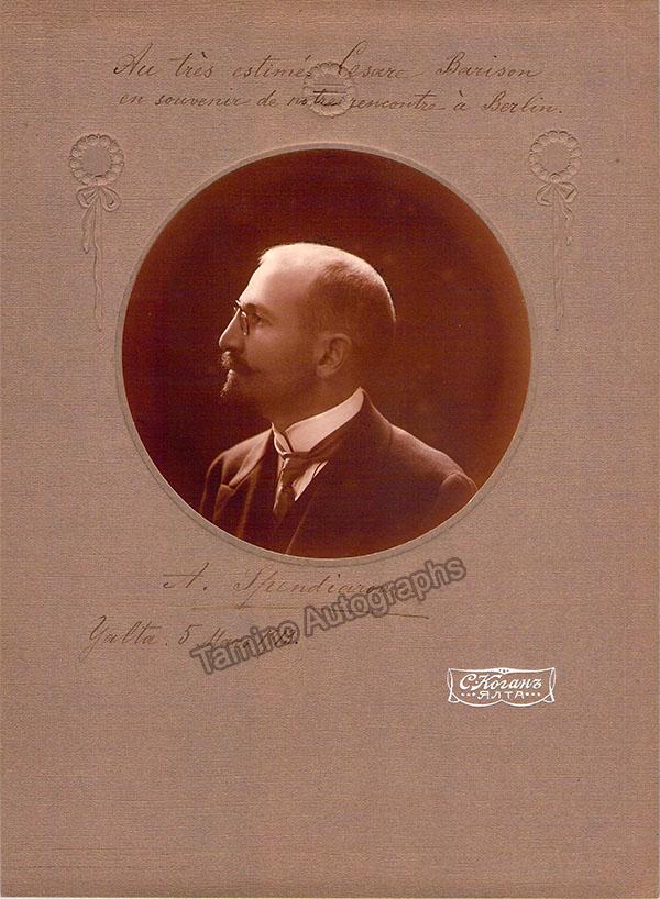 Armenian-Russian composer and conductor (1871-1928), founder of the Armenian national symphonic music and one of the patriarchs of Armenian classical music. Signed photo, inscribed and dated in Yalta in 1913. Size is 7 x 9.5 inches, on a photographer mat by S. Kolanz, Yalta, in excellent condition.