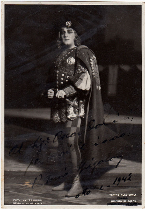 Italian tenor (1900-?), signed postcard photograph, shown in role, inscribed and dated in 1942. Photo by M. Camuzzi, La Scala, Milan. Size is 4 x 5.75 inches, some small smudges on the front and mounting traces on verso, otherwise in very good condition.