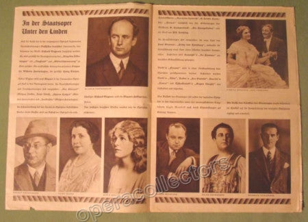 Large promotional brochure from the Berlin Unter den Linden Staatsoper (32 x 22 cm), season 1934-1935. Includes promotianal texts for the new Ring des Nibelungen by Furtwangler and a Mozart-cycle (Figaro, Zauberflote by Furtwangler & Don Giovanni by Erich Kleiber) with many photographs from singers, 8 richly illustrated pages.