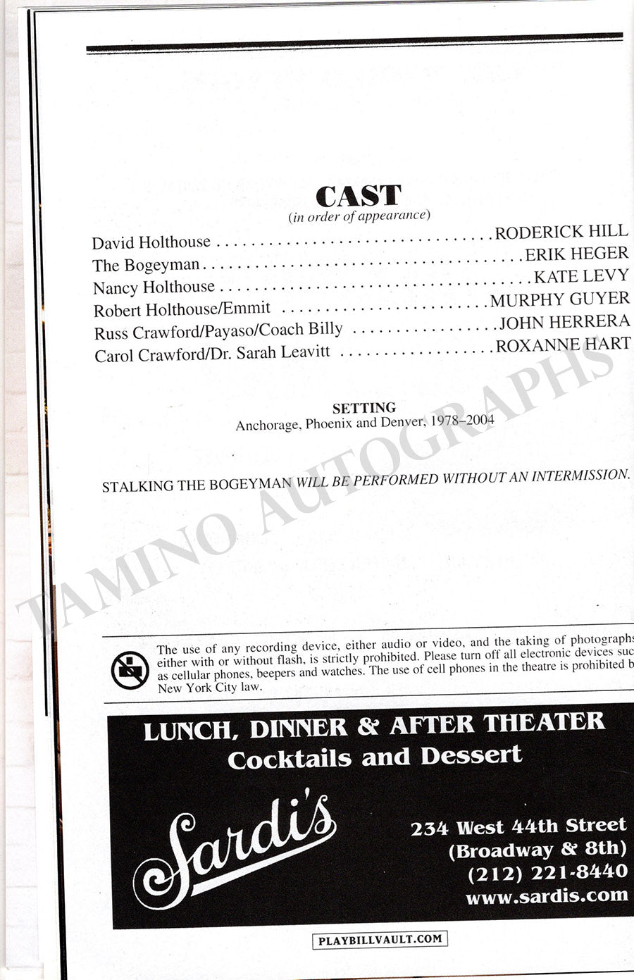 Original playbill for a Broadway production of the musical Stalking the Bogeyman at New World Stage, featuring Roderick Hill, Erik Heger, Kate Levy, Murphy Guyer, John Herrera, and Roxanne Hart; signed by all members of the cast.