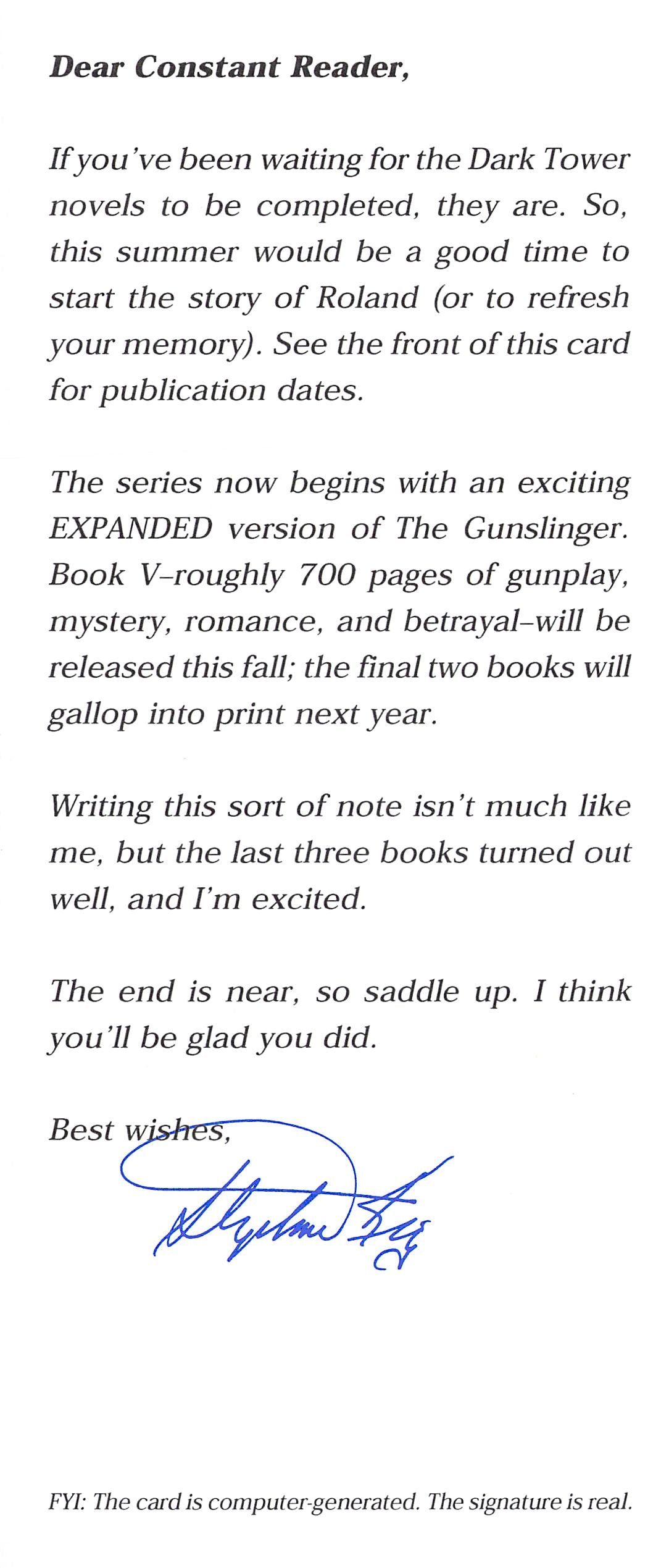 American author (b.1947) of horror, supernatural fiction, suspense, crime, science-fiction, and fantasy novels.  Nice promo card with a short printed text signed by him, with images of his books on verso (can be used as a bookmark). Size is 3.6 x 8.5 inches, in excellent condition.
