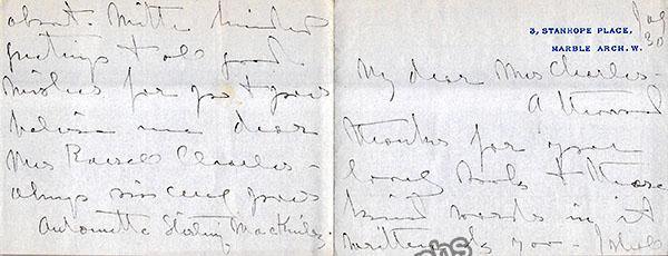 Autograph note signed, signed as "Antoinette Sterling MacKinlay", reflecting her 1874 marriage to John Mackinlay. 4-page folded document (each page is 3.5 x 4.5 inches, unfolded item is 3.5 x 8.75 inches) written in English, in excellent condition.