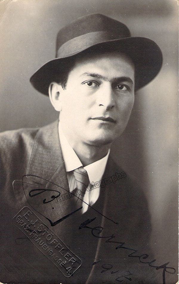 German bass-baritone (1887-1943), signed postcard photograph, shown as himself, dated in 1917. Blind stamped on front by photographer E. J. Stoffler, Graz. Size is 3.25 x 5.25 inches, slight paper loss on edges, otherwise in good condition