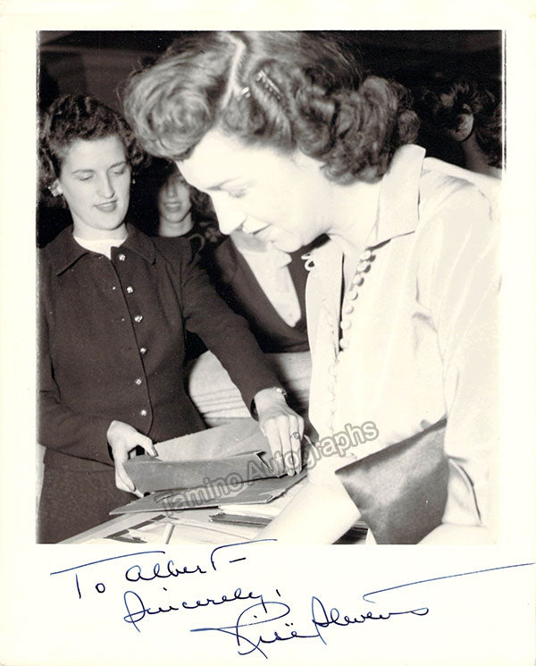 Signed photograph, shown as herself, signing autographs for fans. Inscribed. Size is 8 x 10 inches, very small creases on edges and mounting tape traces on verso, otherwise in excellent condition.