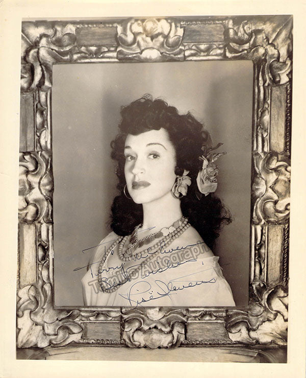 Signed portrait-style photograph, shown in title role of Bizet's Carmen, inscribed. Size is 8 x 10 inches, very slight creases on edges, otherwise in excellent condition.