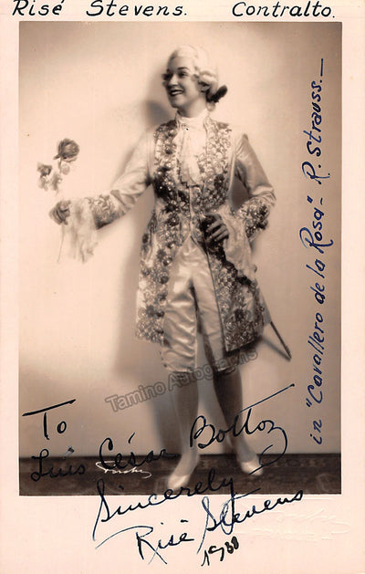 Signed postcard photograph, shown as Octavian in Richard Strauss's Der Rosenkavalier, inscribed and dated in 1938. Blind stamped on front and stamped on verso by photographer Forster, Vienna, Prague, and Carlsbad. Size is 3.25 x 5.25 inches, in very good condition.