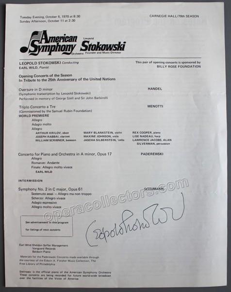 Leopold Stokowski signed program, American Symphony Orchestra. Concert in tribute of the 25th anniversary of UN. New York, Carnegie Hall, October 6th; October 11th, 1970. Handel, Paderewski, Schumann, Menotti Triple Concerto (world premiere).