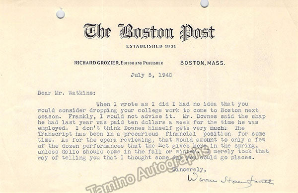 Set of 3 letters as follows: one autograph letter signed, dated in 1939, size is 7.25 x 10.25 inches, storage holes, and folds; two typed letters signed dated in 1940 with the letterhead of the Boston Post where the composer worked as a music critic. Sizes are 6.6 x 7.5 inches and 8.5 x 5.5inches, storage holes, in very good condition.