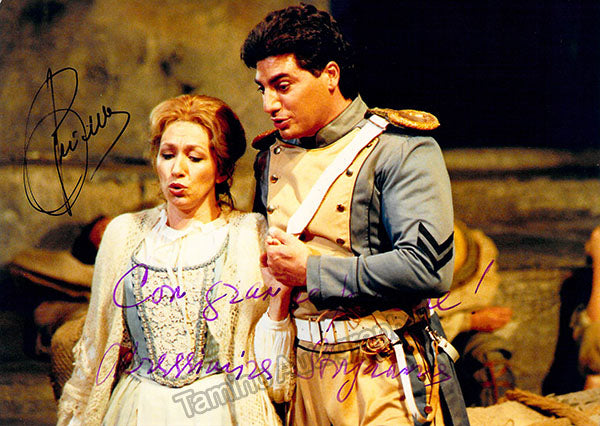 Bulgarian soprano (b.1962) and Argentinian tenor (b.1962), double signed photograph, shown as Michaela and Don Jose in Bizet's Carmen. Size is 5 x 7 inches, in excellent condition.