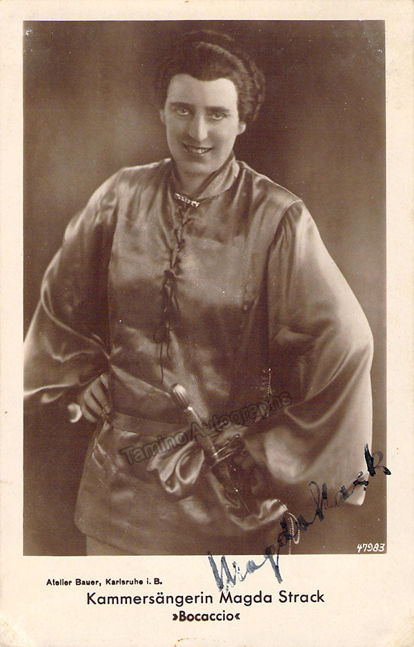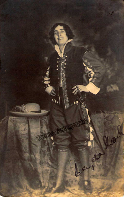 Signed postcard photograph, shown in role in Franz von Suppe's Bocaccio. Photo by Bauer photo studio, Karlsruhe. Signed on front with additional inscription on verso. Size is 3.5 x 5.5 inches, slight wear on edges, otherwise in very good condition.