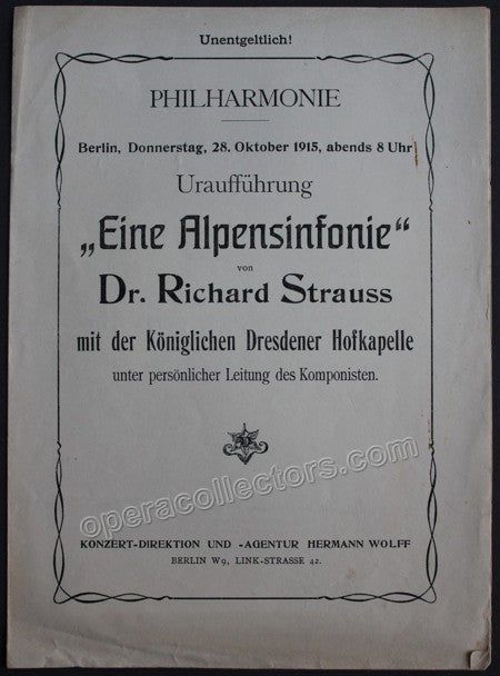 World Premiere program Eine Alpensinfonie - Berlin, Philharmonie, October 28th, 1915. Program Königliche Dresdener Hofkapelle. Conductor : Richard Strauss. Strauss: Vorspiel "Guntram". Strauss: Eine Alpensinfonie ‚ WORLD PREMIERE. Strauss: Till Eulenspiegel. 25 x 18,5 cm, 4 pages