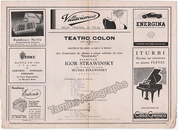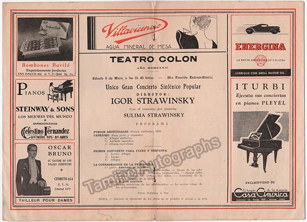 Set of 2 full concert programs, with Igor Stravisnky conducting his own music at Teatro Colón, Buenos Aires, Argentina, 1936. Stravinsky conduct his own son Sulima performing at the piano his father´s concerto for piano, and other pieces. Both full programs, in very good condition
