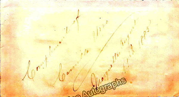Album page signed by her with a short sentiment dated 1885. Size is 4.9 x 2.7 inches, rust stains, in very good condition.
