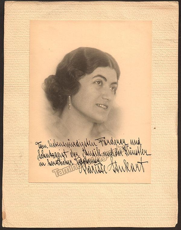 German soprano (1894-?), large signed photo, shown as herself, with a long sentiment in German. Photo is 6.75 x 9 inches, mounted on a mat that is 9.75 x 11.75 inches, in excellent condition.