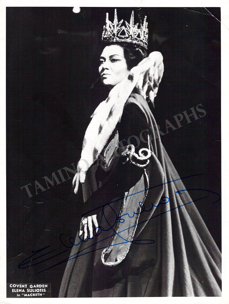 Greek soprano (1943-2004), initially seen as "the next Callas". Signed photograph, shown Lady Macbeth in Verdi's Macbeth. Size is 7 x 9.5 inches, some bends and jagged edges, but otherwise in good condition.