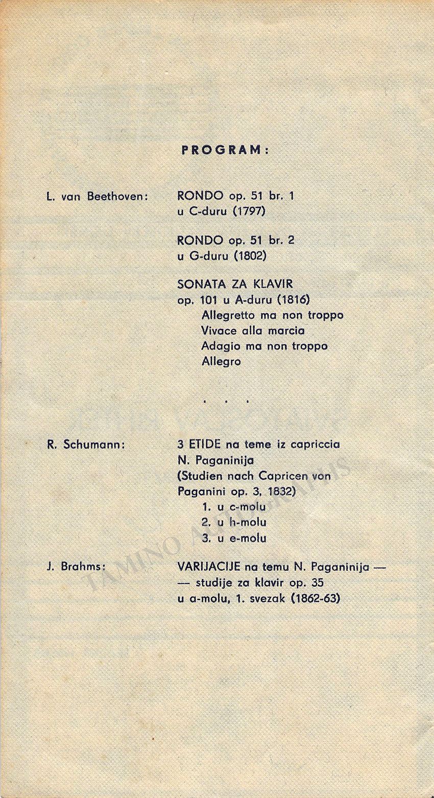 Program for a performance of the star Russian pianist in Zagreb, Croatia, in 1986, signed by him on the first page, performing works by Beethoven, Schumann, and Brahms.