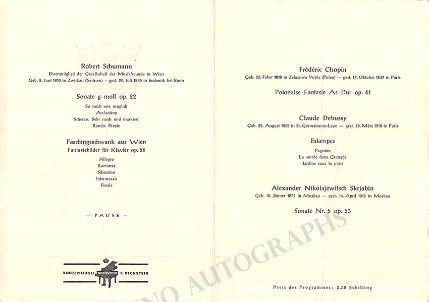 Program for a piano recital in Vienna, on June 1, 1962, featuring the star Russian pianist performing works by Schumann, Chopin, Debussy, and Scriabin.