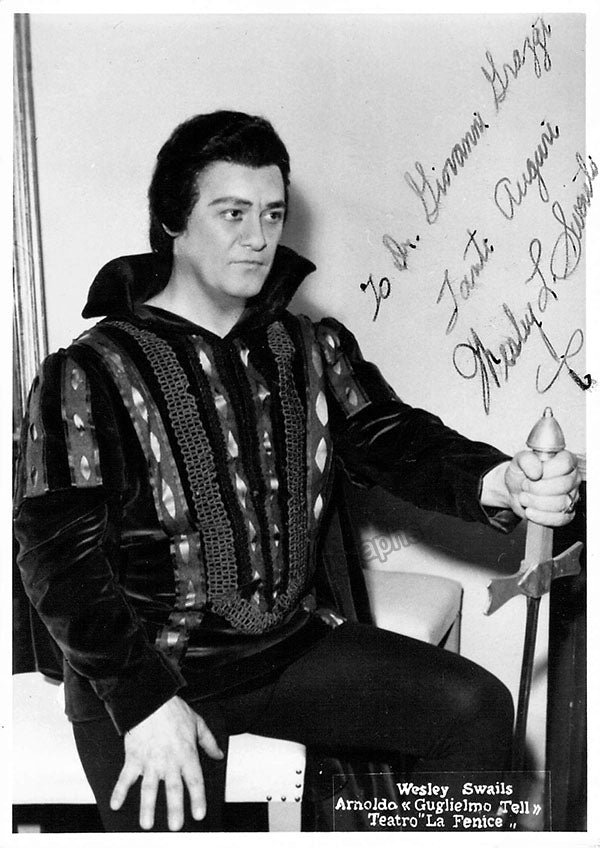 American tenor (1920-2003) who later performed under the name "Gianni Savelli". Particularly known for the role of Arnold in Rossini's Guillaume Tell which he performed with Tito Gobbi in 1962. Signed photograph, shown in that role, inscribed. Size is 4 x 5.75 inches, in excellent condition.