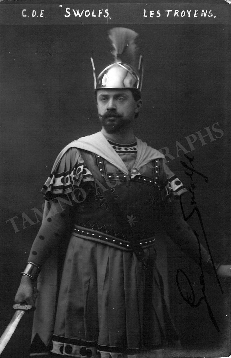 Belgian tenor (1868-1954), signed postcard photograph, shown in Berlioz's Les Troyens. Photo by M. Wagener-Geraerts, Brussels. Size is 3.5 x 5.5 inches, slight paper loss on top right, otherwise in excellent condition.