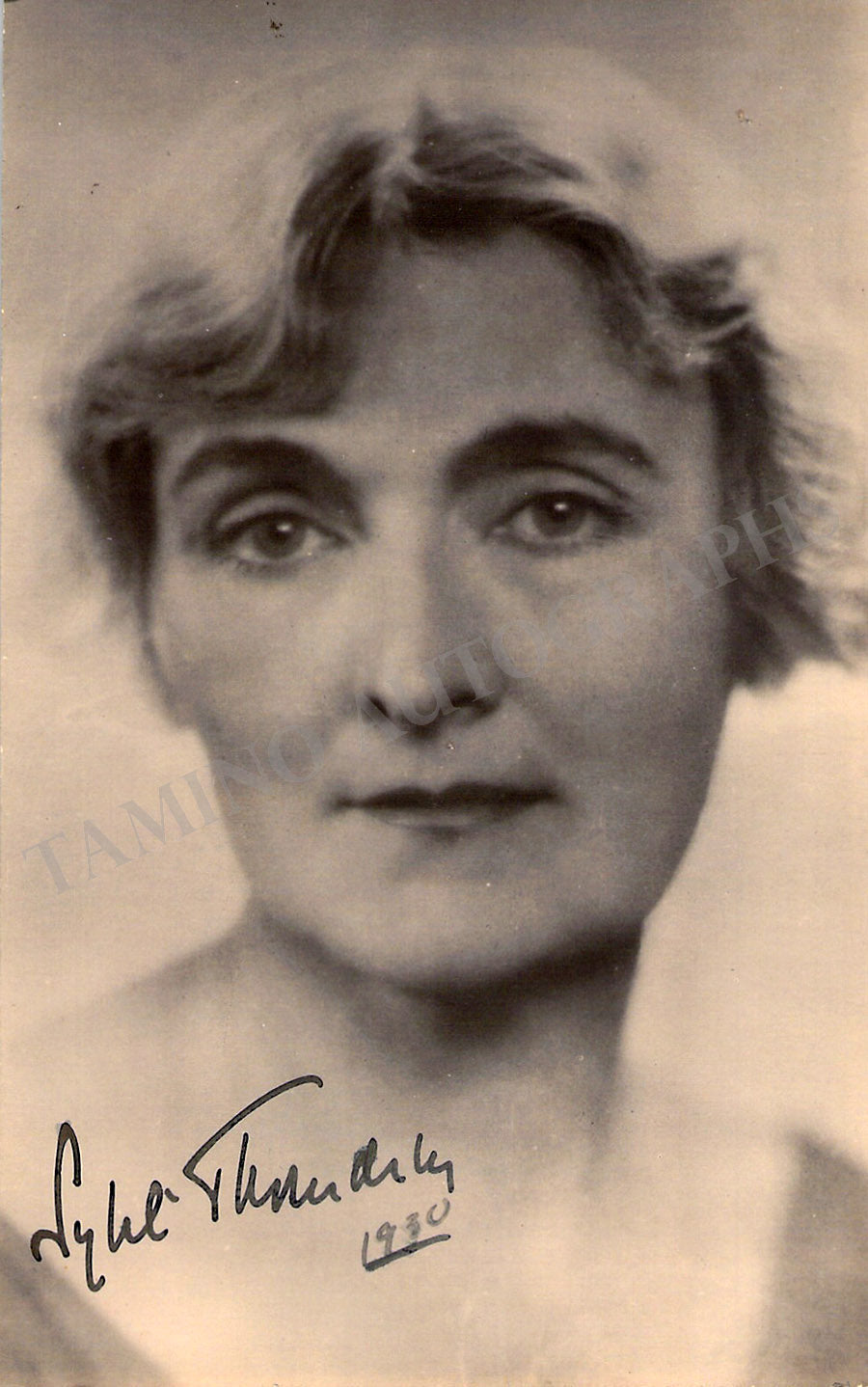 Fine sepia photo postcard signed by her in 1930. Size is 3.25 x 5.25 inches, in excellent condition.