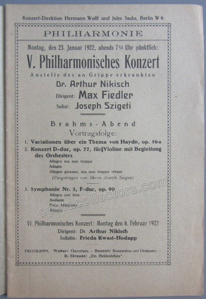 V. Philharmonisches Concert. Berlin, Philharmonie, 23. January 1922. Berliner Philharmonisches Orchester - Joseph Szigeti, Violin - Musical Direction: Max Fiedler - Anstelle des an Grippe erkrankten Dr. Arthur Nikisch - -(Replacing Dr. Arthur Nikisch who has a flu) (Nikisch died that night) Brahms: Haydn-Variationen. Brahms: Violin concerto. Brahms: Symphony Nr. 3. 21 x 18,5 cm. Paperback, 32 pages.