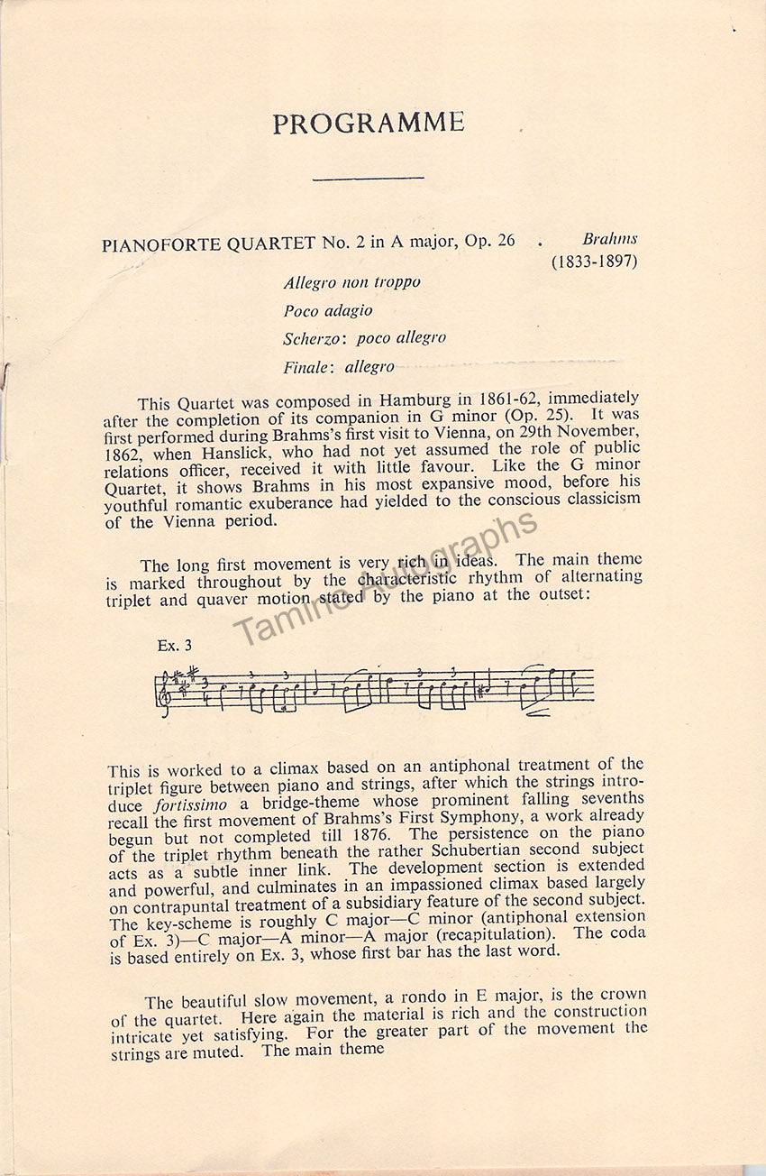 Program for a performance of the famous soloists joined as "The Edinburgh Festival Piano Quartet" at The Royal Festival Hall, London, on September 14th, 1952, signed by Szigeti, Primrose, and Curzon on the first page.