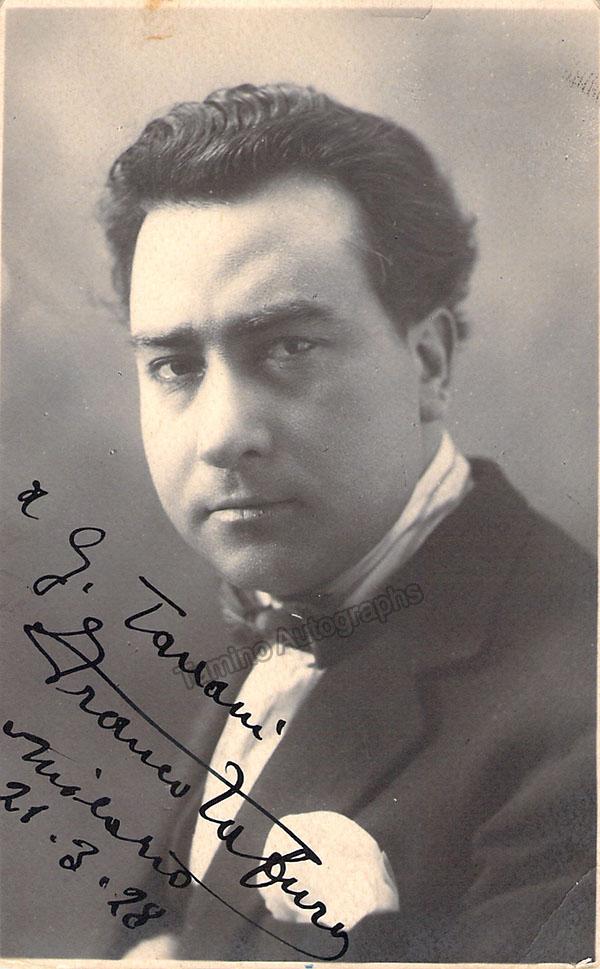 Italian tenor (1895-?), signed photo postcard, shown as himself, inscribed and dated in 1928. Stamped on verso by photographer Rosario Carlino, Lecce. Size is 3.25 x 5.25 inches, slight browning at very top of photo, otherwise in excellent condition.