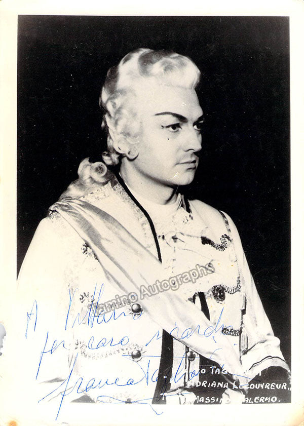 Signed photograph, shown as Maurizio in Cilea's Adriana Lecouvreur, inscribed. Size is 5 x 7 inches, small tear on left and some stains, otherwise in good condition.