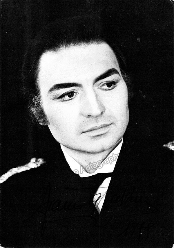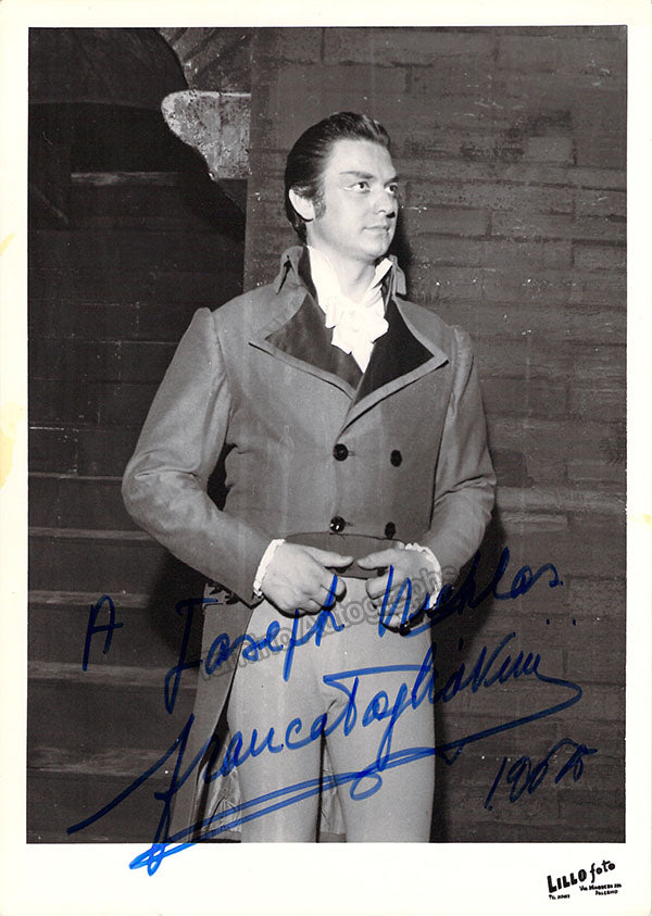 Signed photograph, shown in role (likely Pinkerton in Puccini's Madama Butterfly), dated in 1975. Stamped on verso by photographer Colette Masson, Boulogne. Size is 4 x 5.75 inches, slight paper loss on edges, otherwise in very good condition.
