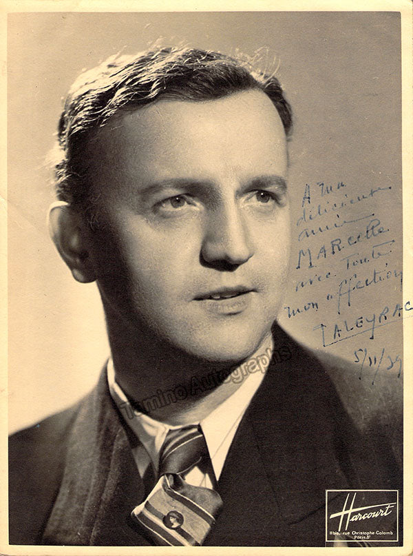 French tenor (1900-1940), signed photograph, shown as himself, inscribed with short sentiment. Stamped on verso by Harcourt photo studio, Paris. Size is 7 x 9.25 inches, small mounting traces on verso, otherwise in very good condition.