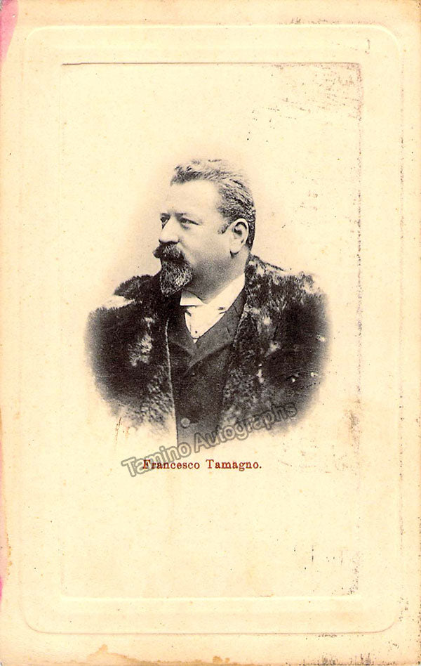 Signed card, dated in Chicago (possibly in 1893), signed as "F. Tamagno". Size is 2 x 3 inches, in excellent condition. Also included: unsinged postcard with a print photo, shown as himself, size of 3.5 x 5.5 inches, slight traces on edges, otherwise in excellent condition.
