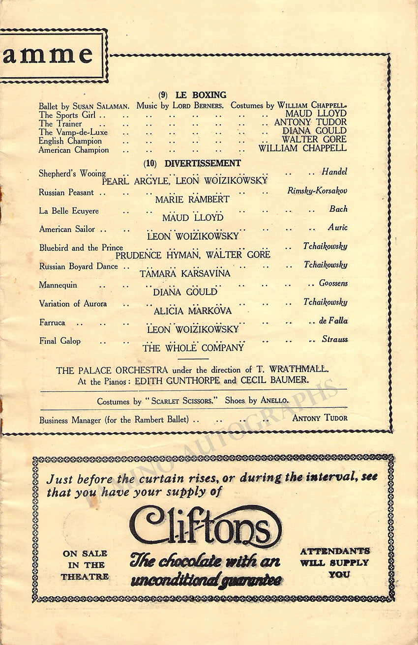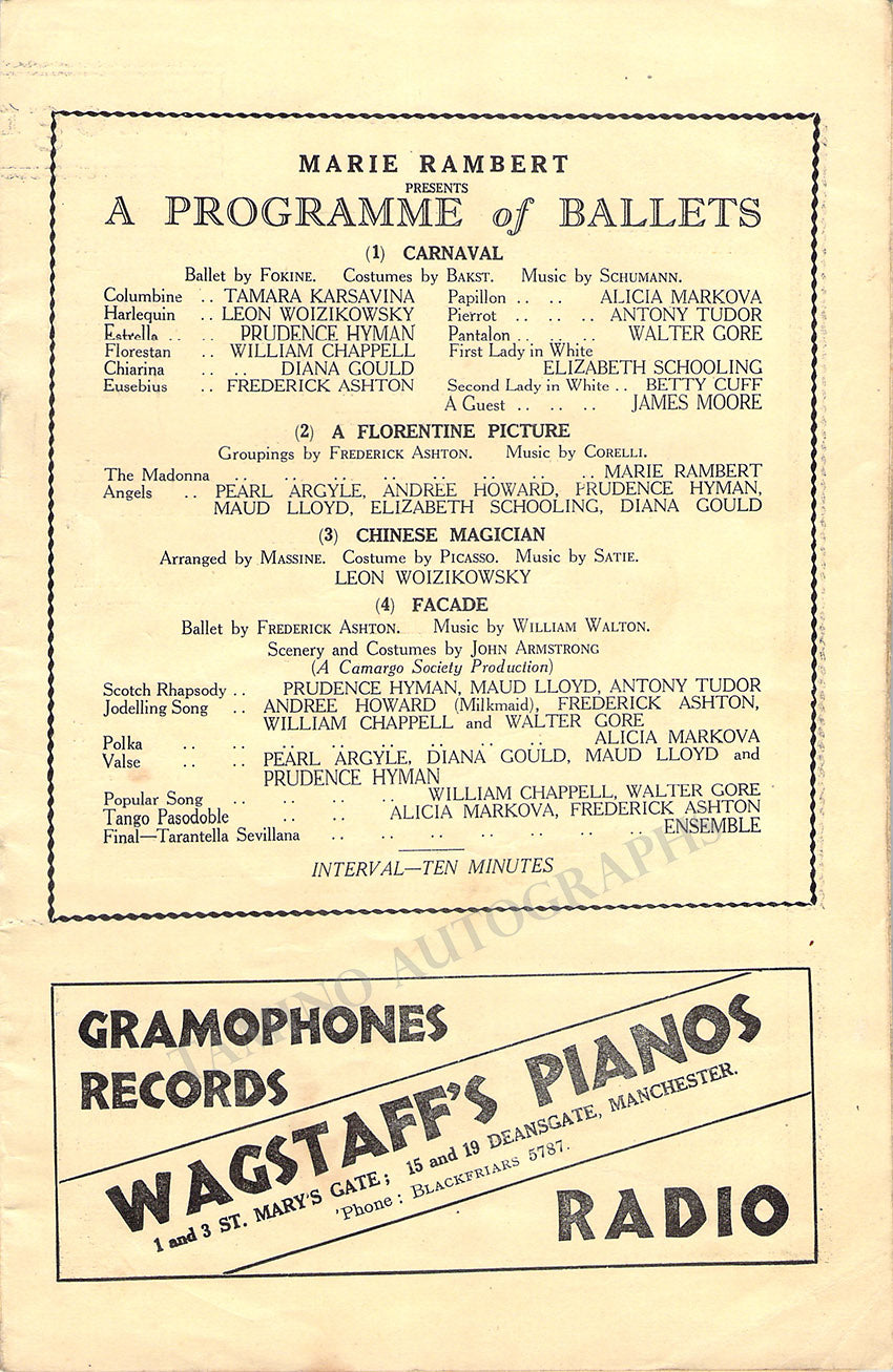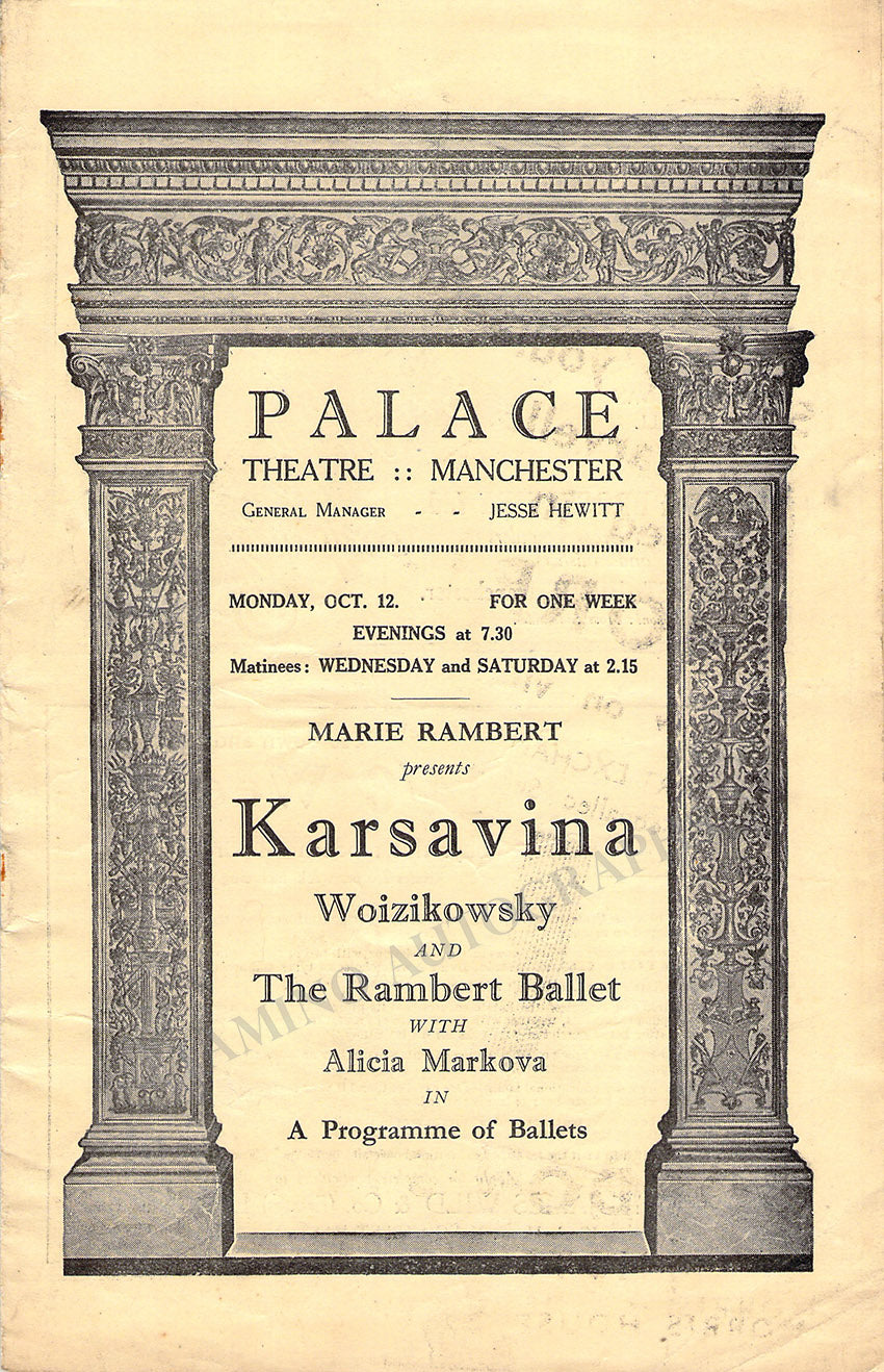 ALSO INCLUDED is a program for a ballet performance at the Palace Theater (Manchester, United Kingdom) featuring Alicia Markova and the Rambert Ballet. Size is 5.4 x 8.3 inches, 4 pages, in very good condition.