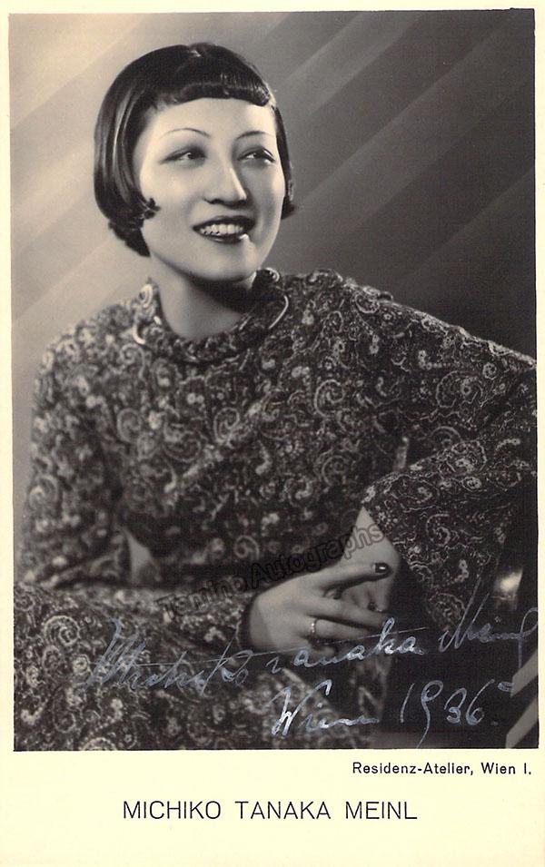 Japanese soprano and film actress was mostly based in Europe (1909-1988), signed photo postcard, shown as herself, dated in 1936. Blind stamped by photographers of Residenz-Atelier, Vienna. Size is 3.25 x 5.25 inches, in excellent condition.