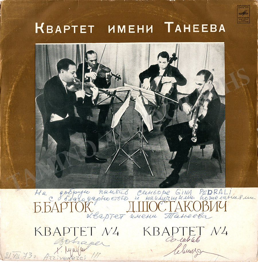 Their LP record performing string quartets by Bartok and Shostakovich signed by all four members. Size is 12.25 x 12.25 inches, record included (not tested), in very good condition.