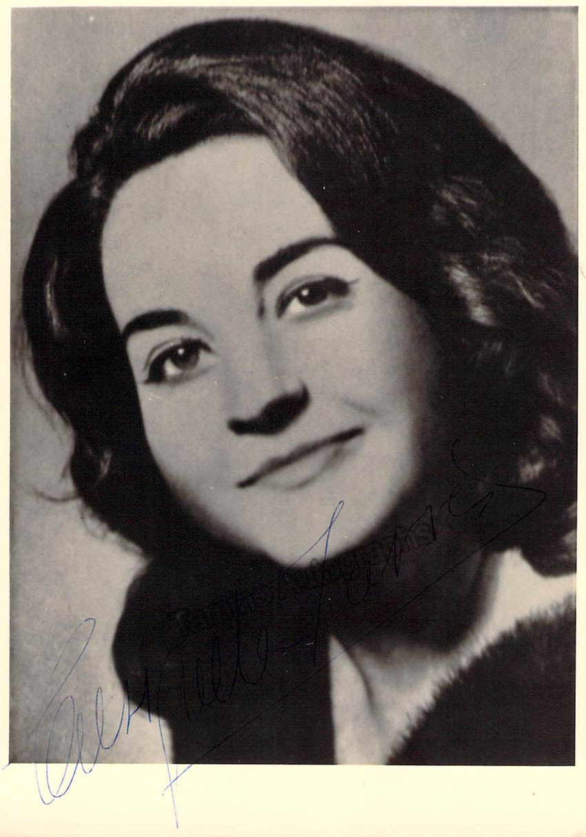 Signed photo of the Spanish soprano (b. 1934), shown as herself. Size is 4 x 5.75 inches.