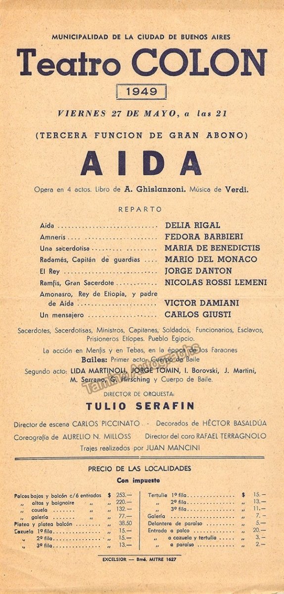 Playbill announcement for a performance of Verdi's Aida at Teatro Colon, Buenos Aires, Argentina, 1949; starred by Delia Rigal, Mario Del Monaco, Fedora Barbieri, Nicola Rossi-Lemeni, under the baton of Tullio Serafin. Size is 6 x 12.5 inches, central fold, in excellent condition.