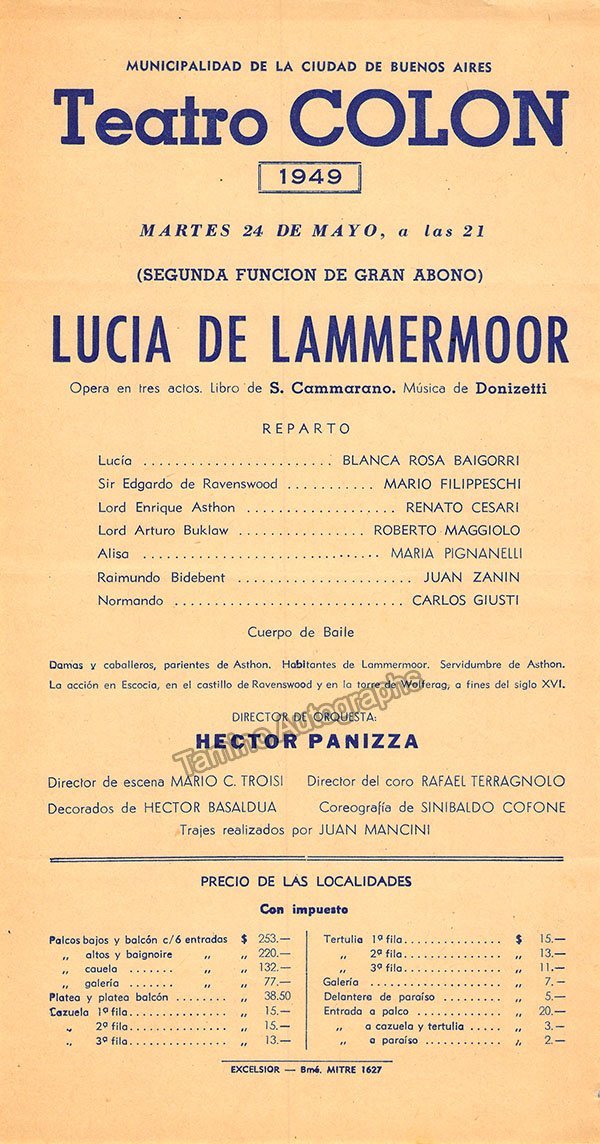 Playbill announcement for a performance of Donizetti's Lucia di Lammermoor at Teatro Colon, Buenos Aires, Argentina, 1949; starred by Blanca Rosa Baigorri, Mario Filippeschi, Renato Cesari, under the baton of Ettore Panizza. Size is 6.1 x 11.75 inches, central fold, otherwise in very good condition.