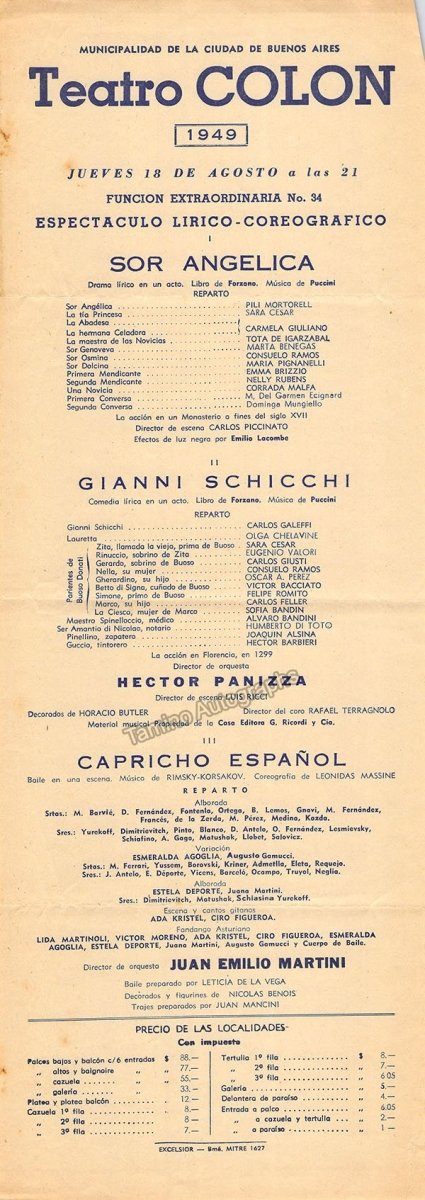 Playbill announcement for a performance of Puccini's Suor Angelica and Gianni Schicchi at Teatro Colon, Buenos Aires, Argentina, 1949; starred by Pili Mortorell, Sara Cesar, Carlos Galeffi, Olga Chelavine and others, under the baton of Ettore Panizza. Size is 6.2 x 17.5 inches, central fold, in excellent condition.