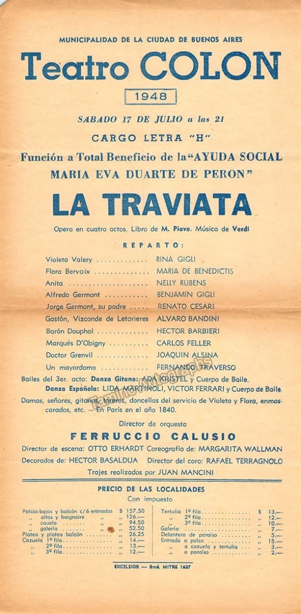 Playbill announcement for a performance of Verdi's La Traviata at Teatro Colon, Buenos Aires, Argentina, 1948; starred by Rina Gigli, Beniamino Gigli, Renato Cesari, under the baton of Ferruccio Calusio. Size is 6.1 x 12.5 inches, central fold, rust stain at the center, otherwise in very good condition.